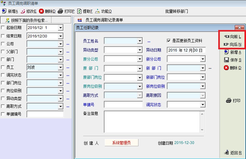 如题,调岗调职记录,卡片“向前、向后”单击后,显示的记录与“列表不符”,且会停留在某人的记录,功能失效。