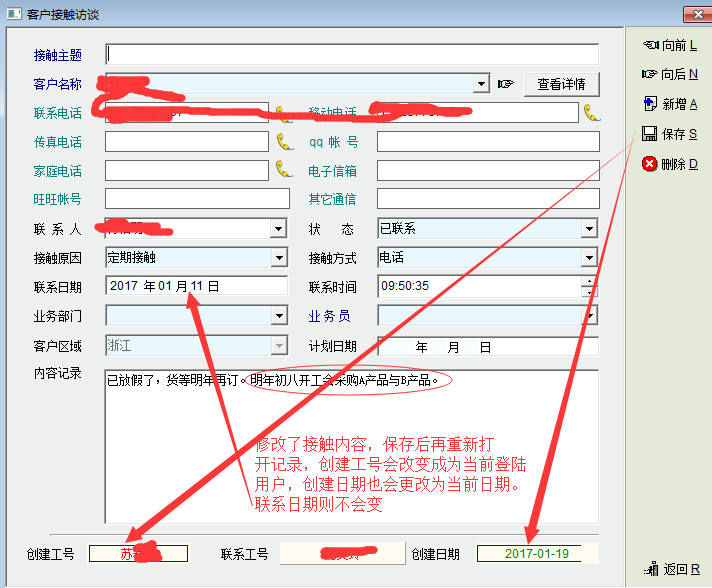 讨论_客户接触记录中修改内容保存后重新打开,创建工号与创建日期会发生更改_产供销
