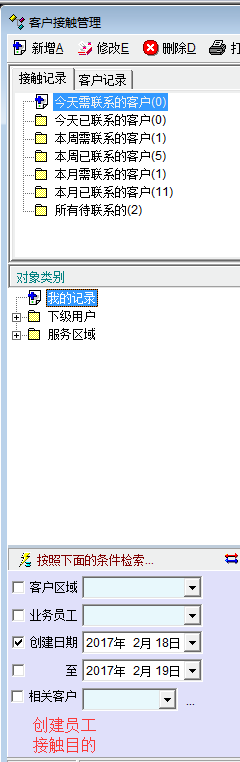 推荐_客户接触记录列表增加按“创建员工”,“接触目的”检索条件。_产供销
