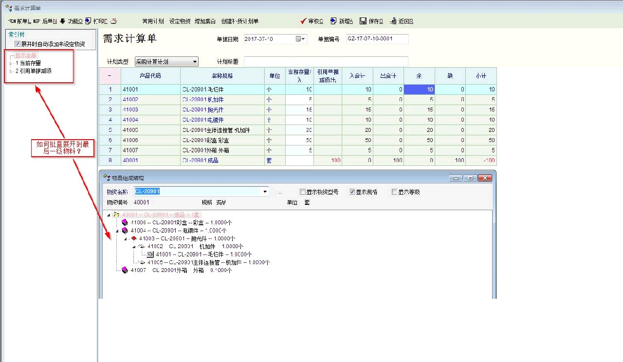 例如我上面例子,客户下了CL-20901产品100套,需求分析单,只能算出需求补100套产品,需不能计算出要补多少原材料和配件。