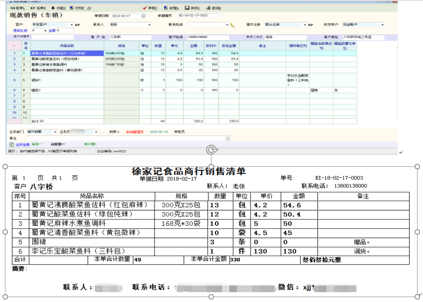 上图为原单据,中图为打印效果。其中的客户关键字为输入过的客户可以直接输入关键字查找并选择客户,然后自动填入其相关信息--联系人,联系电话与地址(只支持一个联系人与一个电话),这样可以不做客户资料录入。