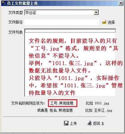 员工文件批量上传功能,关于“文件名的规则”,标记了“其他信息”的文件是无法导入,具体如图: