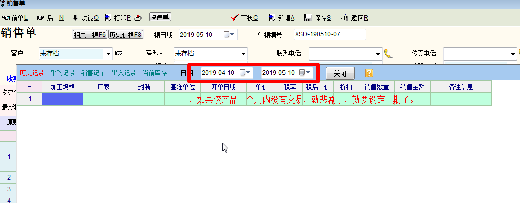 新版本当输入一个产品后查询历史价格,系统默认的是显示该客户一个月内购买该产品的记录。如果一个月内该产品没有交易,则查询结果是空值。如果该产品交易频繁,问题不大,如果该产品一个月内没有交易,就悲剧了,就要设定日期了。这个改进完全是不合理的:如果该产品交易非常频繁,一般是不需要查询价格的,熟能生巧,价格及其它属性一般都牢牢记在心中了,根本不需要查询。如果该产品很久才交易一次,不记得价格及其它一些属性而需要查询历史记录,则必须再次选择时间,麻烦得要死,效率太低。