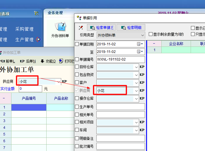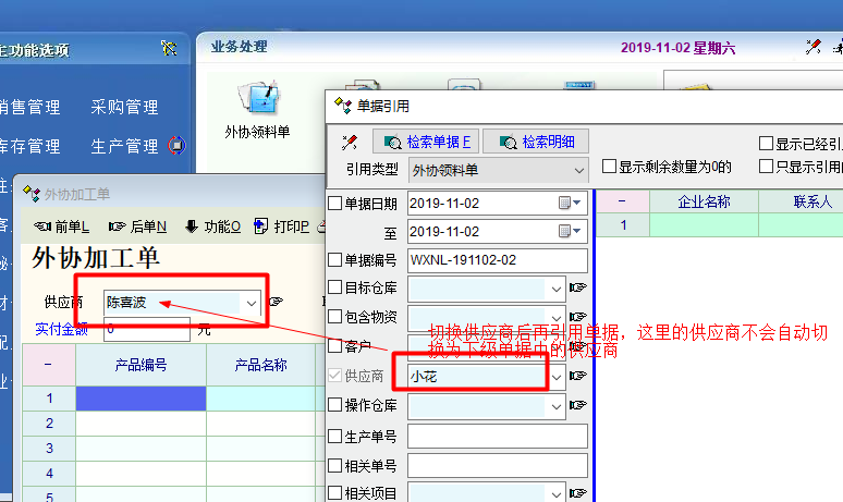 如图,业务流程中引用是限定供应商的,第一次引用时会限定供应商,但新增外协加工单并更换供应商后,再引用相关单据时,“单据引用“中的供应商还是限定为上一单的供应商,并不会自动切换为当前的外协加工单的供应商。