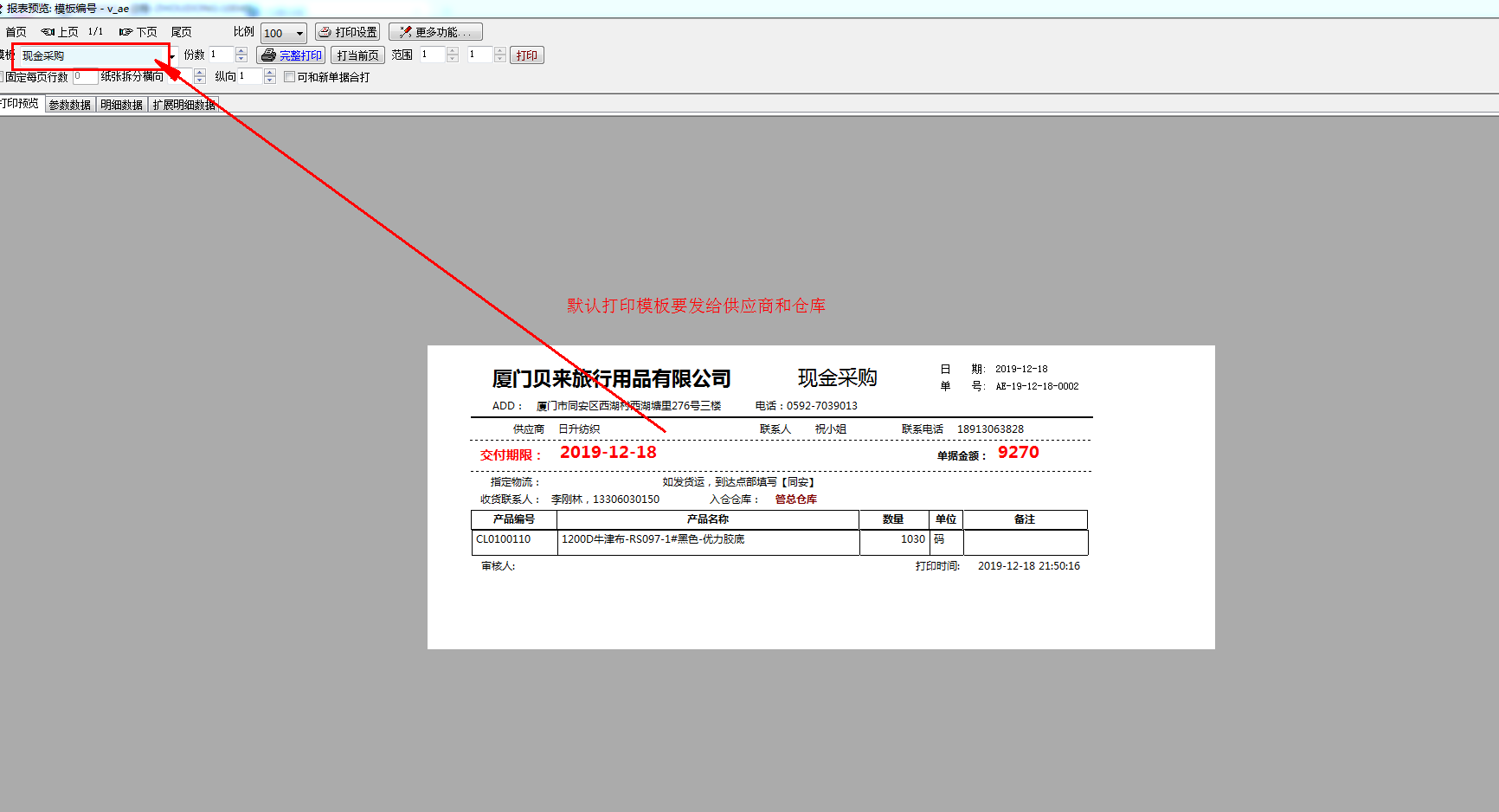 1,采购部创建采购订单--选择打印模板1(打印采购单发给供应商和仓库收料人员)--单据上有个功能按钮【打印物料标签】【打印采购物资的条码标签,我们要提前打好条码标签交给仓库收货的人员,因为有很多材料我们要到物流点去自提,打印条码标签最好是能够在oti软件打印,这样我们能少安装软件,oit打印的时候会根据物资的折算数量,比如我采购1030码面料=20支30Y,这个20(自动换算成21)来决定打印物料标签的数量,在物料标签上面除了打印品名、编号(我们把编号做条码),还要打印本采购单的单号,以及默认送往的仓库名字】