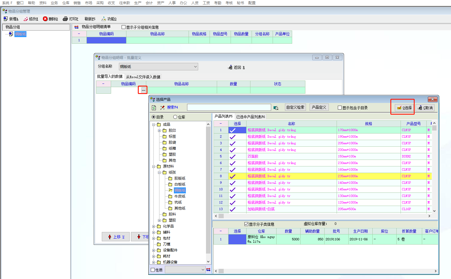 2、在产品资料管理模块/更多功能/分组管理,我们进行分组管理/物品分组明细管理/点击物品名称后面的点,进行多品种选择添加时,可以批量选择,但是添加后还是只能添加一条记录,这样导致效率很低,数量多的情况下甚至无法使用该功能。