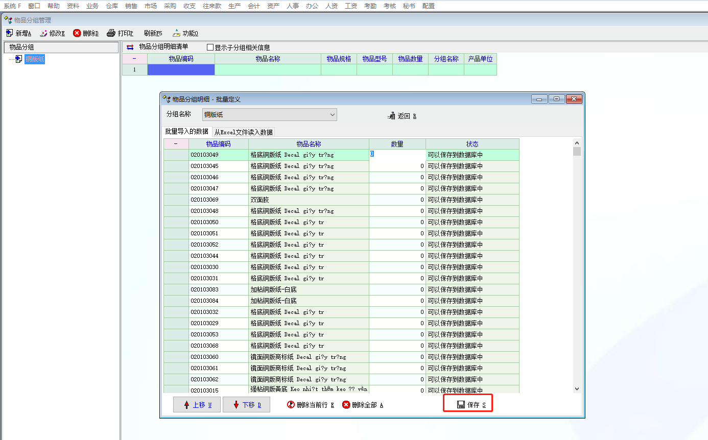 第二个问题,是你的操作有误,批量添加步骤:选中物品分组,点击鼠标右键,点击批量新增明细,在弹出来的物品分组明细-批量定义的界面,点击物品编码空白列右边的3个点控件,在弹出的物品选择窗口批量选择后,点击选择,把选中的物料明细添加进来后在点击保存即可