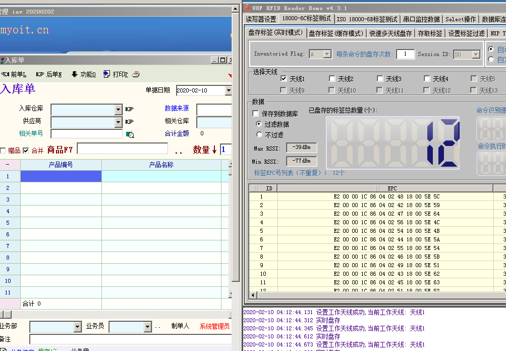 就是在库区门口安装RFID模块天线,希望通过RFID来实现进销存系统的出库,类似使用扫码枪出库,只是无需人员干涉。目前碰到的问题是,服务器端的测试软件能感应到电子标签,但是不会主动输出数据,因此无法录入到进销存系统内。