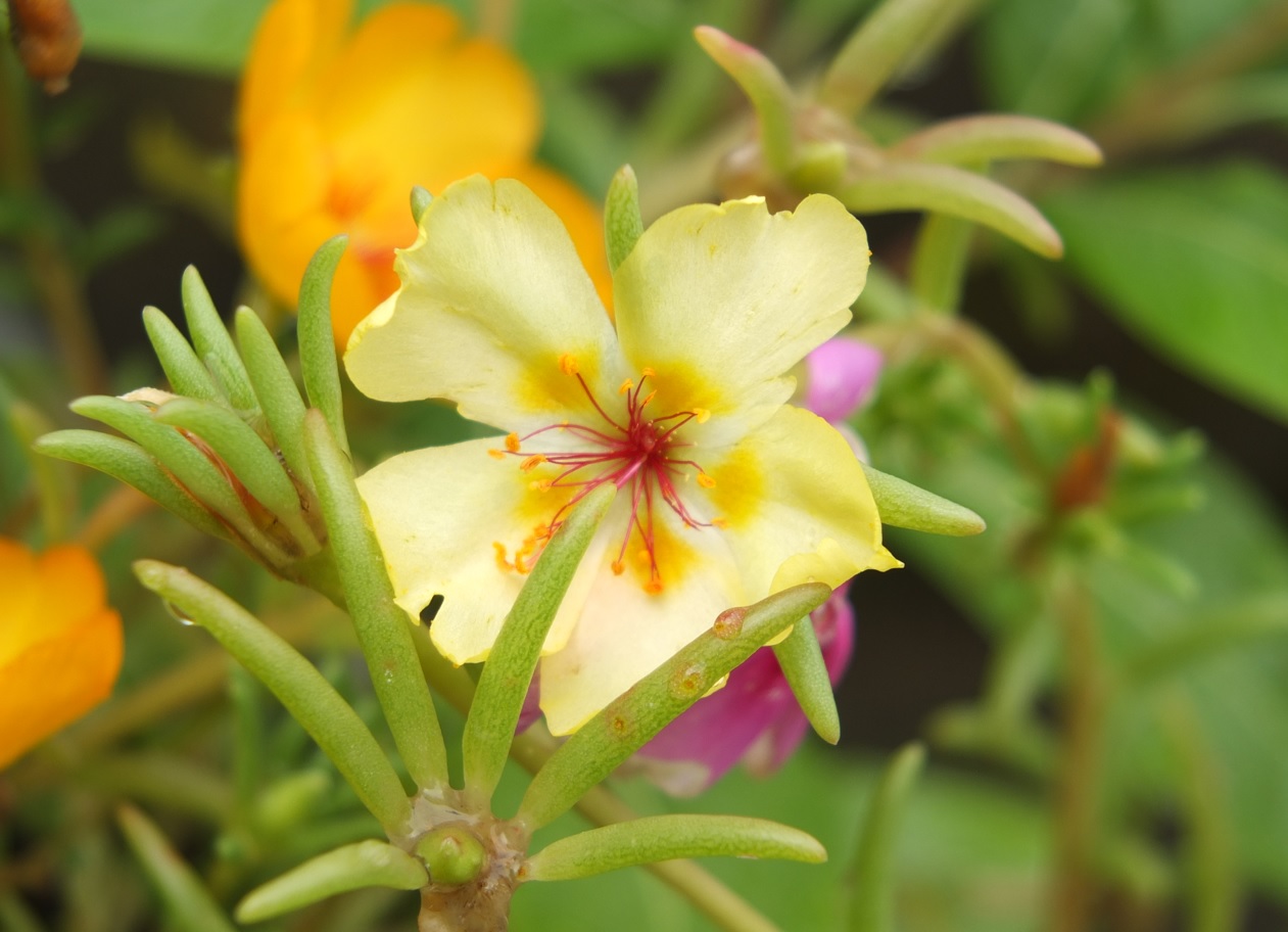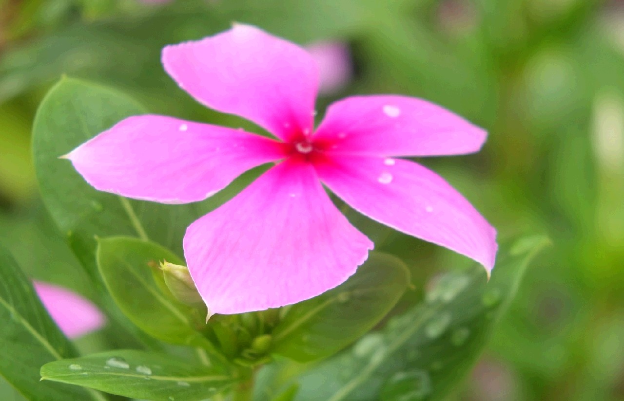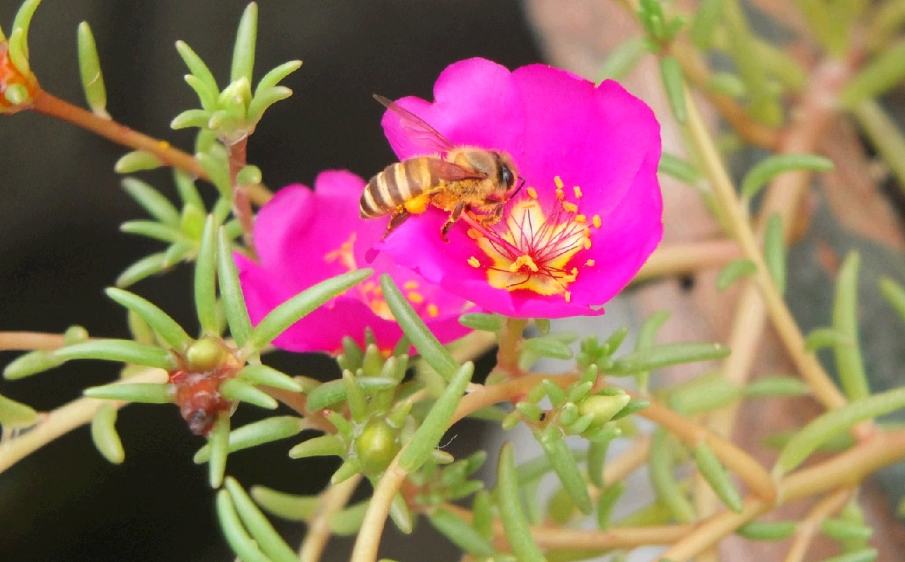 晚上下过雨,小花们开得神采奕奕,蜜蜂也忙着飞来飞去采蜜。