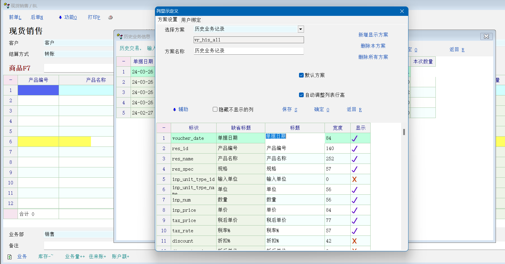 在现货销售的历史信息业务列表中能否显示货物型号?列显示定义中也没有选项